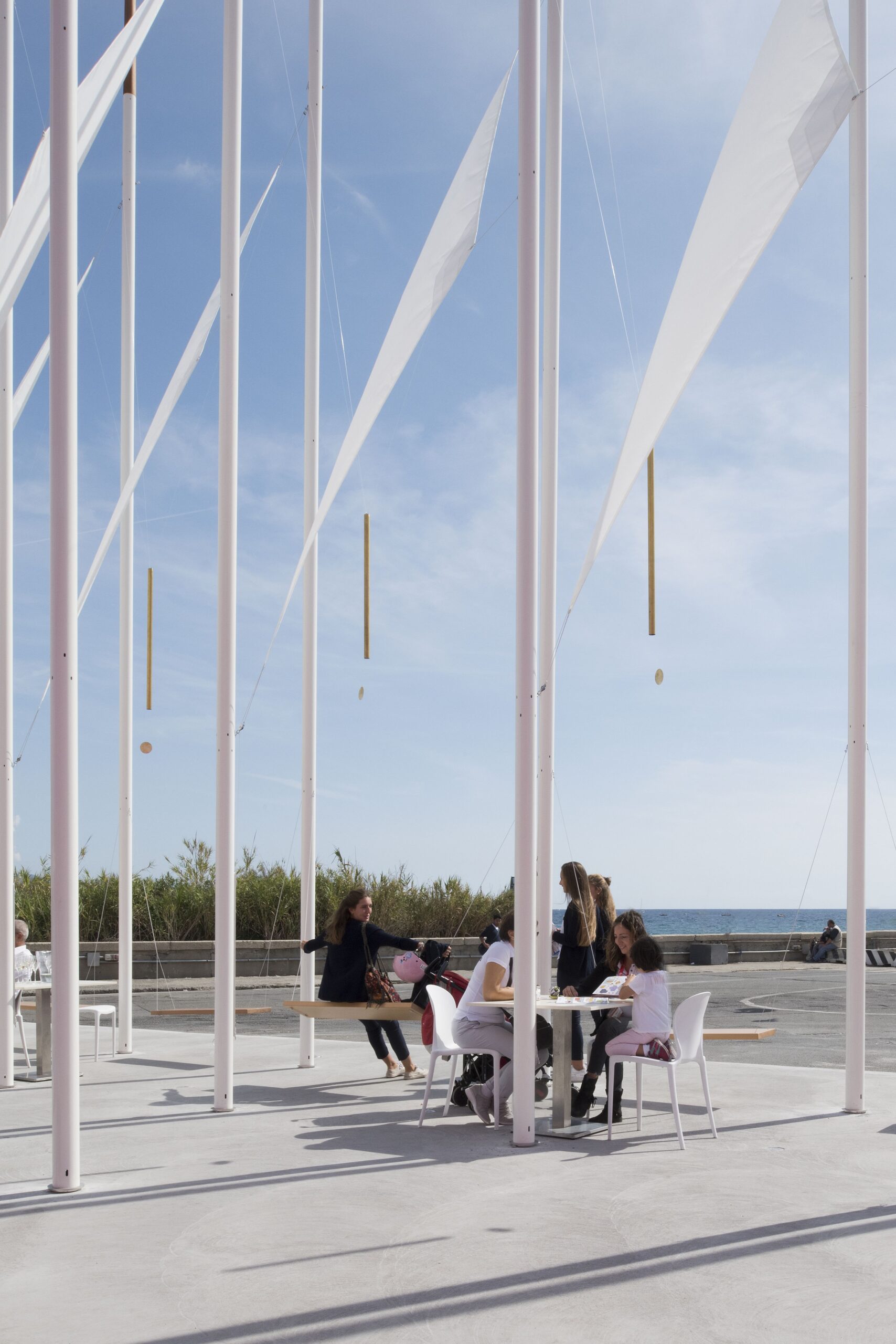 Piazza del Vento is also a collective artwork, realized with the participation of musician Roberto Pugliese alongside Enter Studio and Matteo Orlandi, who created the “Melodie Mediterranee” sound field played by the wind. A system of brass canes of varying lengths with internal wooden clappers, arranged according to a precise spatial pattern among the masts, translates the sounds of the mare nostrum into chords drawn from the Mediterranean musical scale, brought to life by the breeze.