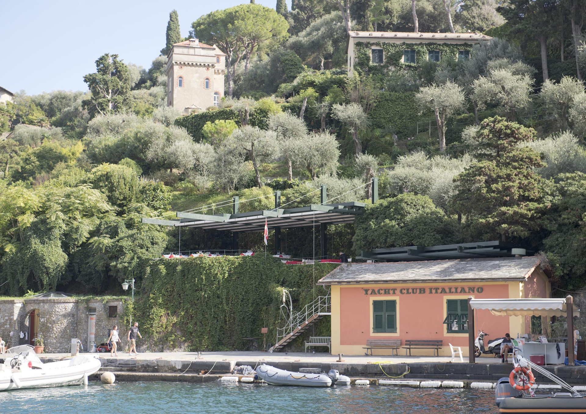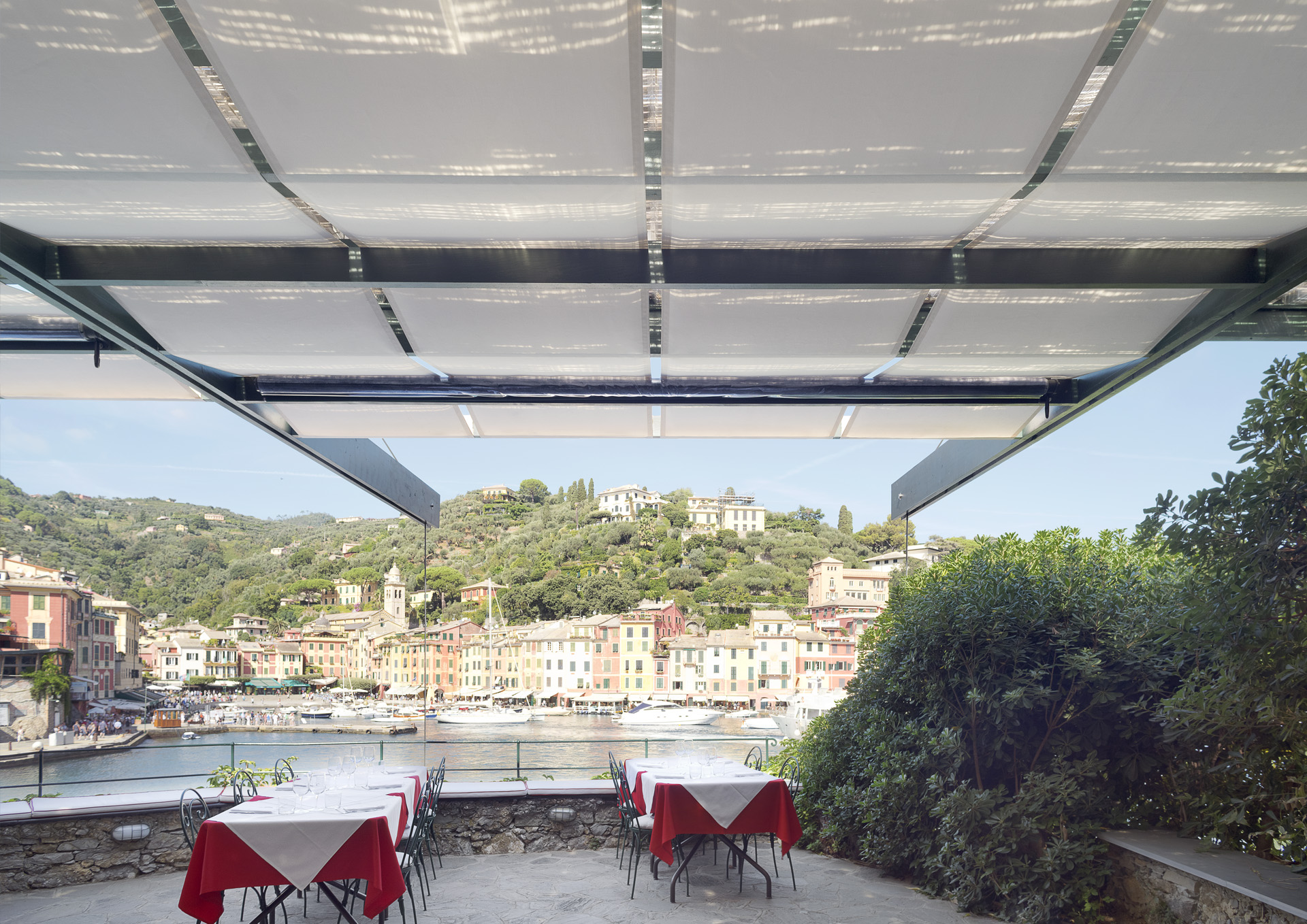 The project for the summer location of the Yacht Club Italiano in Portofino consists of a new large canopy over the existing terrace.